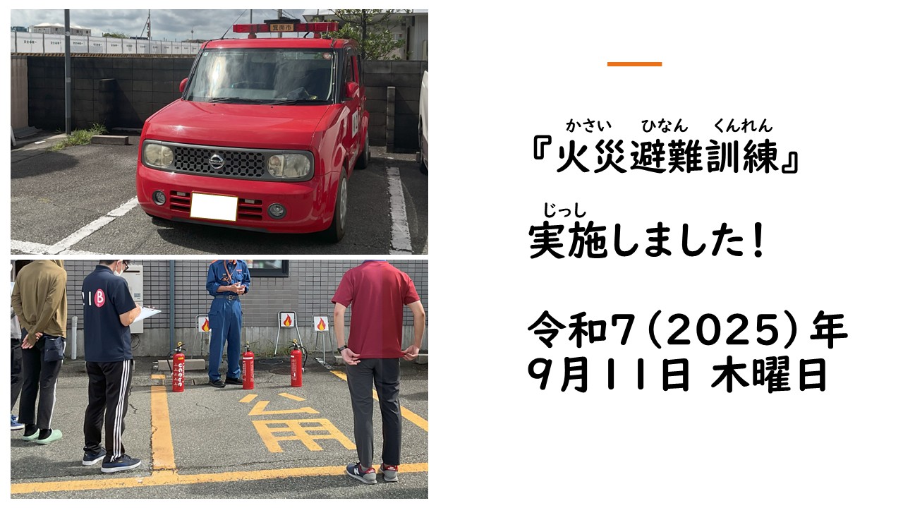 ←ホームへ戻る令和7年度 火災避難訓練を実施しました! 2025.10.07 令和7年度 火災避難訓練を実施しました! 令和7年9月11日(木) 火災避難訓練 実施しました! 詳しい内容はこちらをクリック! 萱野本部にて、 集団療育センターLIB(重心、重心外)と3施設合同で、 火災を想定して行いました。 箕面市消防署のご協力のもと、避難誘導、消火訓練を行い、 ご利用者さまにもご参加いただきました! ご利用者さまと自身の安心安全を第一に、今後も取り組んでまいります。