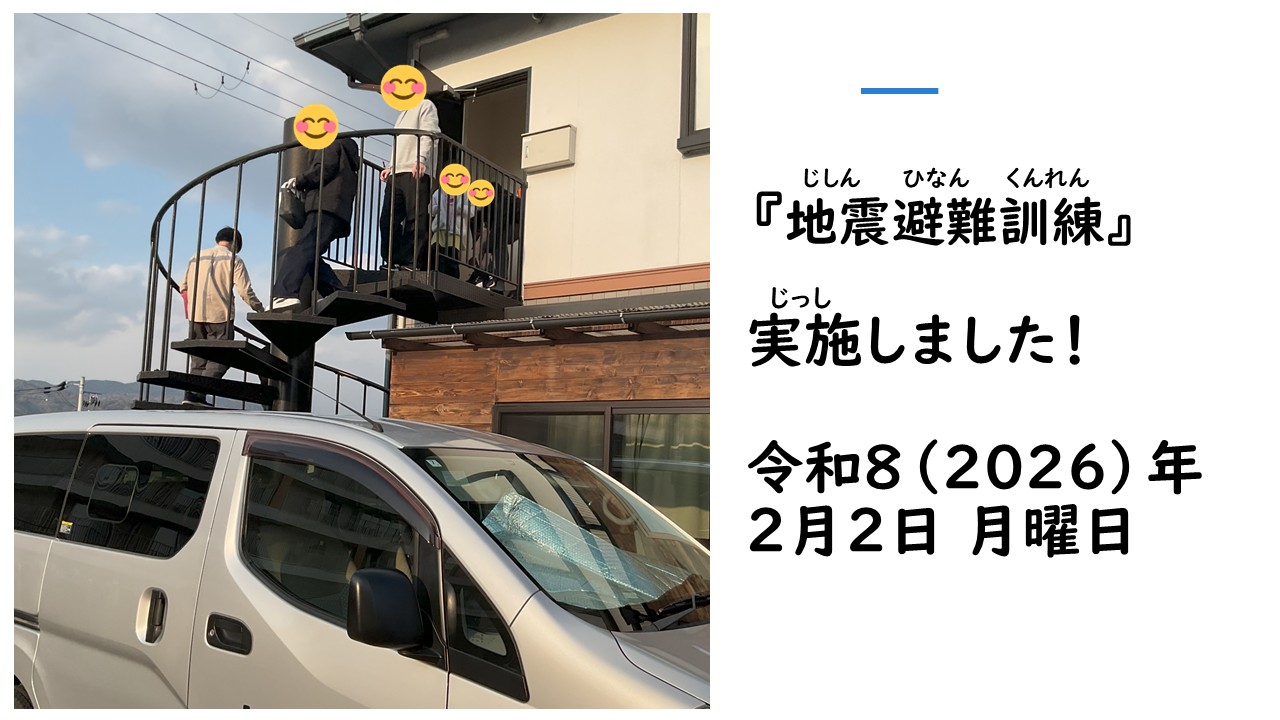←ホームへ戻る令和7年度 地震避難訓練を実施しました!【ココスマイル本部】 2026.02.17 令和7年度 地震避難訓練を実施しました!【ココスマイル本部】 令和8年2月2日(月) ココスマイル萱野本部にて、 地震避難訓練を実施しました。 詳しい内容は、こちらをクリック! 療育実施中に地震が発生したと想定し、 ご利用者さまにもご協力いただいて訓練を行いました。 ココスマイルでは年に2回(火災・地震)の避難訓練を実施しております。 ご利用者さまと自身の安全を第一に、今後も取り組んでまいります。