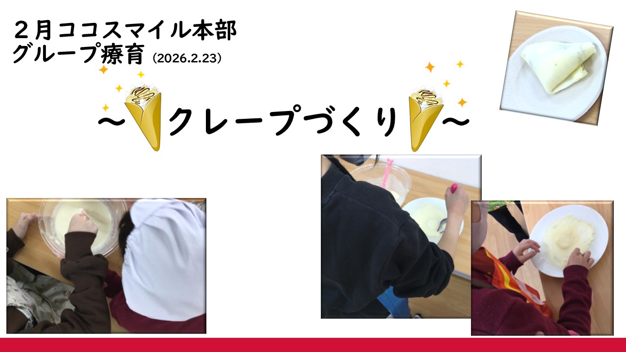 ←ホームへ戻る令和8年2月 グループ療育『クレープづくり』 2026.04.07 令和8年2月 グループ療育『クレープづくり』 令和8年2月23日(月) ココスマイル萱野本部にて、 グループ療育『クレープづくり』を実施しました。 6名のお子さまが参加し、 クレープづくりの工程を役割分担しながら、 楽しく取り組むことができました。 詳しい内容はこちらをクリック! 活動の詳細にご興味ある方は、ぜひクリックしてご確認をください。