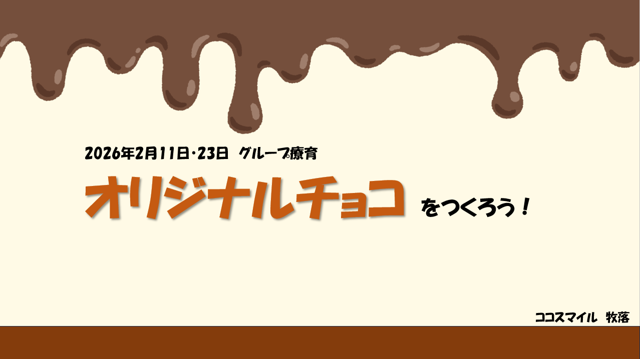 ←ホームへ戻る令和8年2月 グループ療育『オリジナルチョコを作ろう!』 2026.04.28 令和8年2月 グループ療育『オリジナルチョコを作ろう!』 令和8年2月11日・23日に、ココスマイル牧落でグループ療育『オリジナルチョコを作ろう!』を実施しました! 計12名の子どもたちが参加し、板チョコを割って湯煎で溶かし、型に入れて固まったチョコをデコレーションしました🍫 ルールをしっかり守り、お子さん同士で助け合いながら楽しくチョコを作ることができました😊 詳しい内容はこちらをクリック! 詳しい情報は、ぜひクリックしてご確認ください!
